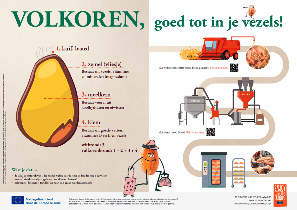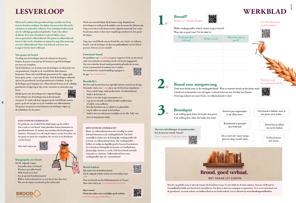 In België wordt educatief materiaal verspreid via de schooltijdschriften in samenwerking met uitgeverij Averbode (Zonneland en Tremplin). Deze uitgeverij heeft een mooie folder over brood gemaakt. Die oogt goed en is leuk met de puzzels en spelletjes verzorgd. Nog belangrijker is dat daar een lessenpakket bijhoort. Het werd ontwikkeld door het eigen team educatieve medewerkers van Averbode. Kathou Wagemans: “Op basis van de wetenschappelijke informatie die wij hen ter beschikking stelden, kwam er een handig lessenpakket tot stand. Daarop vinden de leraars QR-codes die verwijzen naar visuals en achtergrondinformatie. Begin september (editie 1 van 2022) werd dit materiaal naar de scholen uitgestuurd.”
